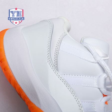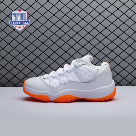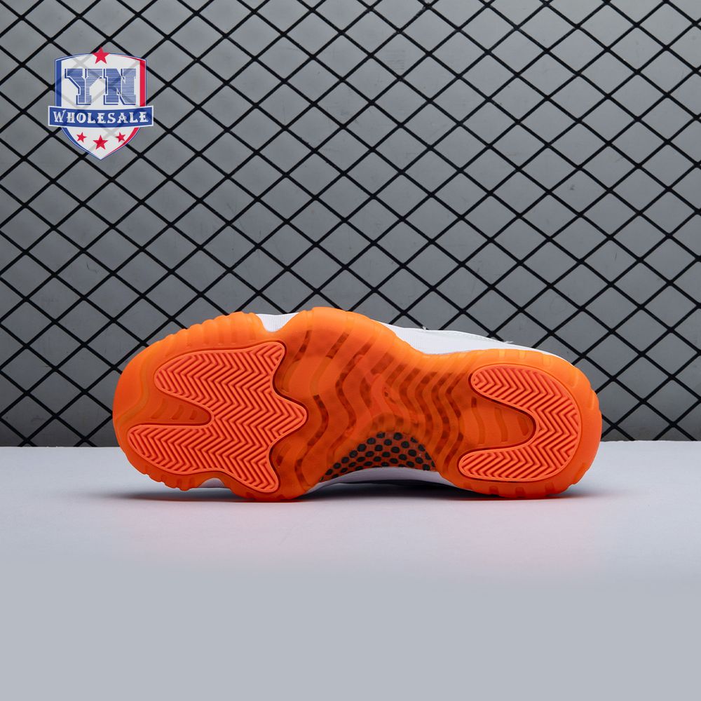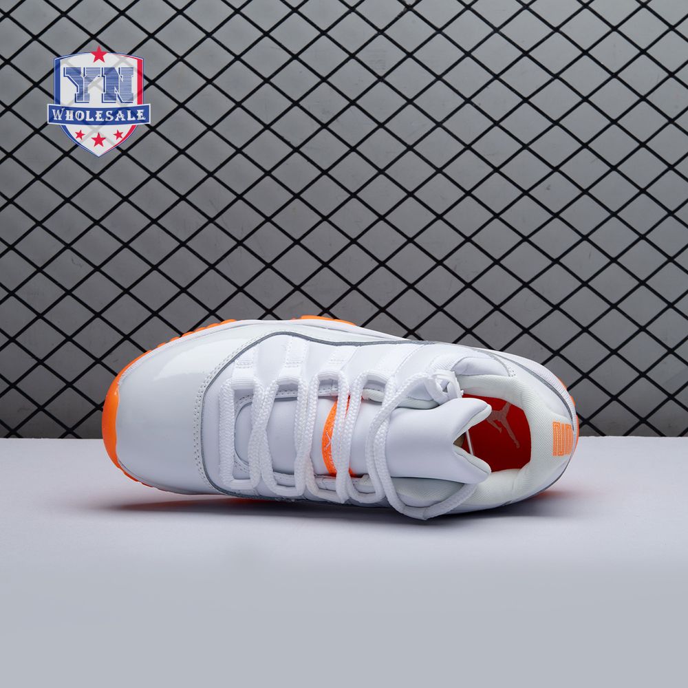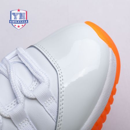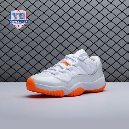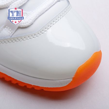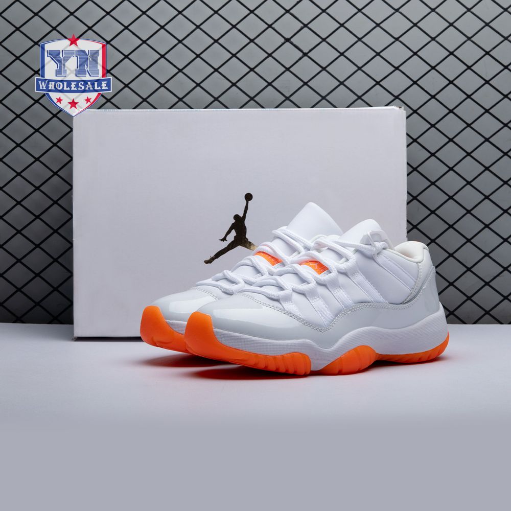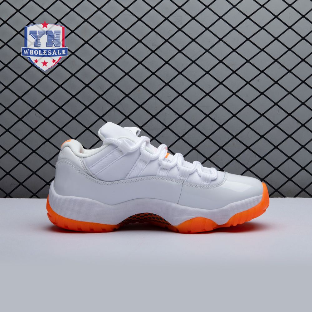 The women"s Air Jordan 11 Retro Low "Bright Citrus" revives a simplistic two-tone colorway initially released in 2001 and previously reissued in 2015 as a kids" exclusive. The low-top utilizes a white leather upper with webbing lace loops and a shiny patent leather overlay in a matching white finish. Vibrant orange accents stand out on the sneaker"s branding elements, including an embroidered Jumpman on the heel tab. Lightweight cushioning is provided by a Phylon midsole, reinforced underfoot by a carbon fiber spring plate and a translucent orange rubber outsole.