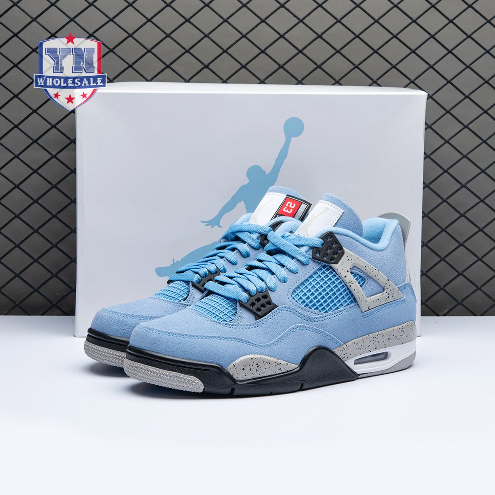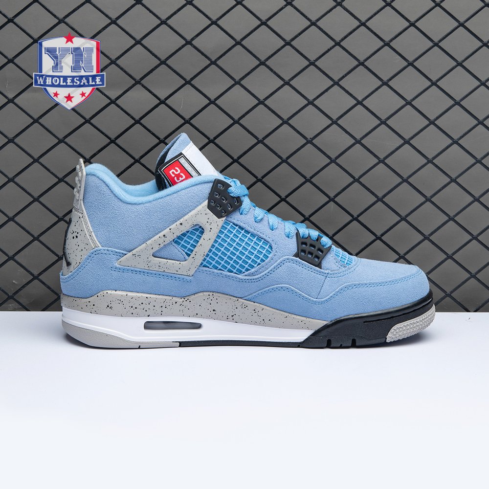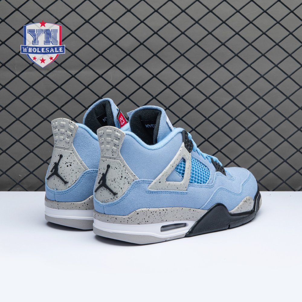 The Air Jordan 4 Retro "University Blue" updates the classic silhouette with a suede upper in a familiar hue inspired by Michael Jordan"s UNC alma mater. The bright blue palette is contrasted by a speckled grey finish on the sneaker"s supportive wings and back heel, featuring a raised Jumpman icon in black. Secondary Jumpman branding adorns the woven tongue tag, designed to mimic a jock tag that typically appears on the bottom hem of Jordan jerseys.