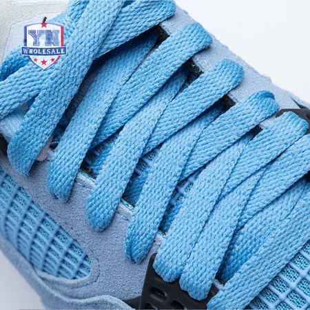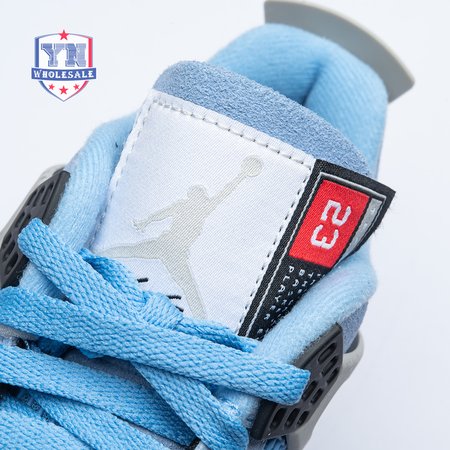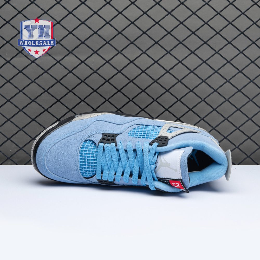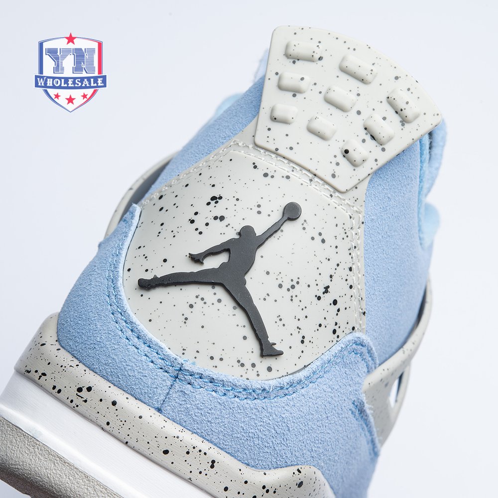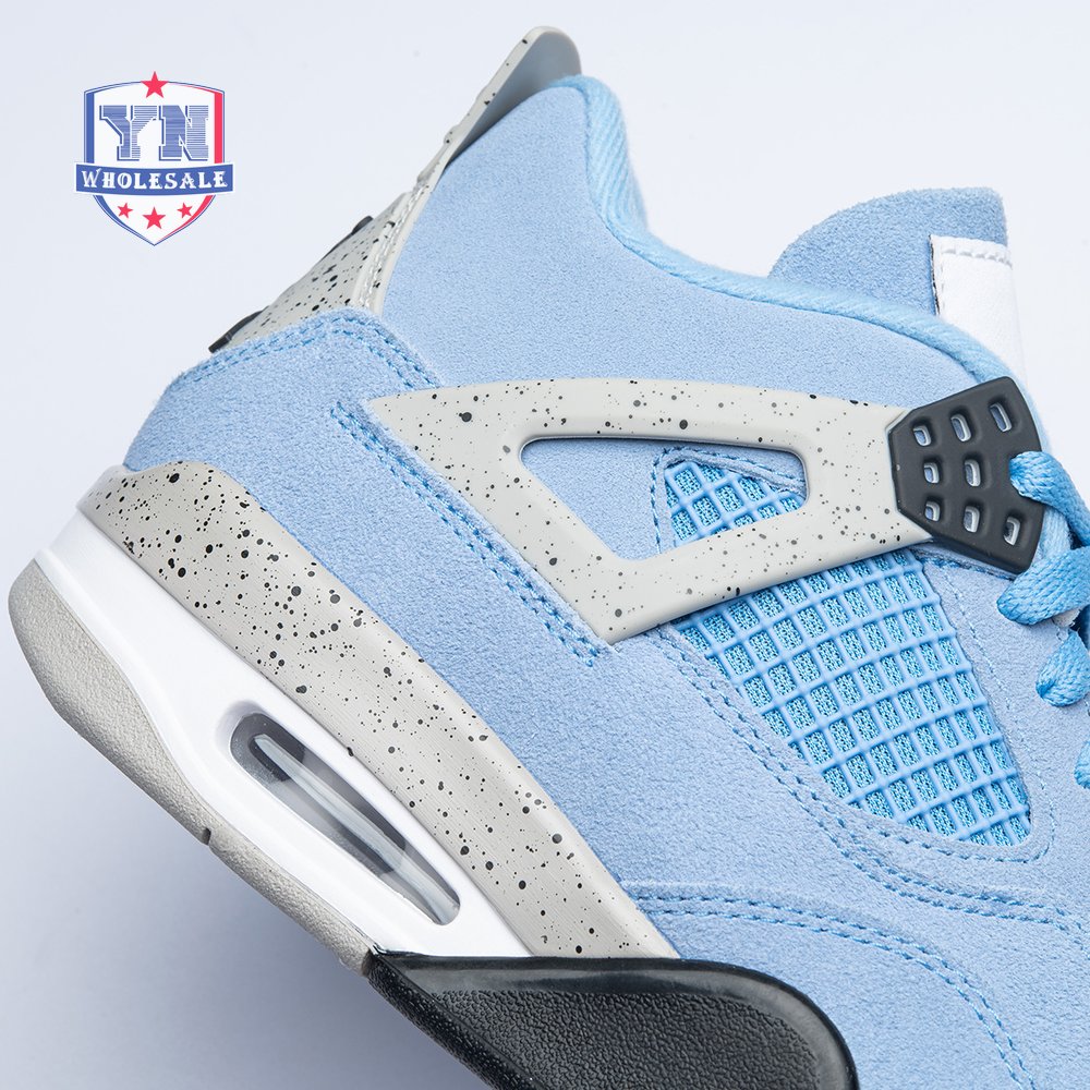 The Air Jordan 4 Retro "University Blue" updates the classic silhouette with a suede upper in a familiar hue inspired by Michael Jordan"s UNC alma mater. The bright blue palette is contrasted by a speckled grey finish on the sneaker"s supportive wings and back heel, featuring a raised Jumpman icon in black. Secondary Jumpman branding adorns the woven tongue tag, designed to mimic a jock tag that typically appears on the bottom hem of Jordan jerseys.