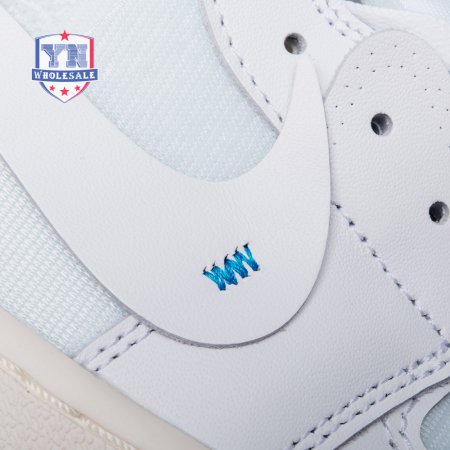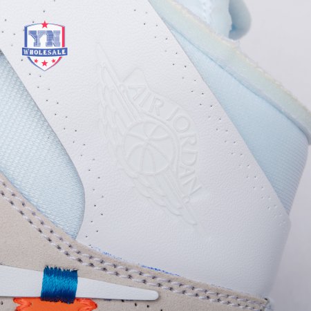 The Off-White x Air Jordan 1 Retro High OG BG 'White' 2018 features an allover white premium leather and mesh upper, with deconstructed Swoosh branding, Wings logos on the ankles, "AIR" lettering on the midsole, branded text on the side panels, and orange tabs. This kids model is a reimagination of the "Chicago" themed Jordan 1.