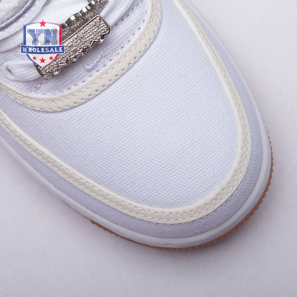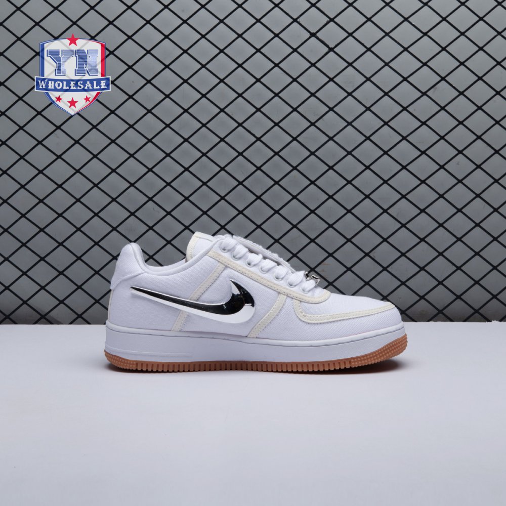This Air Force 1 designed by Travis Scott dropped at ComplexCon 2017 in celebration of the silhouette"s 35th anniversary. The shoe features a white canvas upper with a reflective trim, white midsole, and a classic gum rubber outsole. It also comes with a upside down Nike Air branding on the heel and a customizable Velcro Swoosh and patches. The Nike Air Force 1 AF100 pack also included an Air Force 1 Low by Virgil Abloh, a Lunar Force 1 by Acronym, an Air Force 1 High by Don C, and an Air Force 1 Low by Roc-A-Fella. The pack received a wider release in December of 2017.