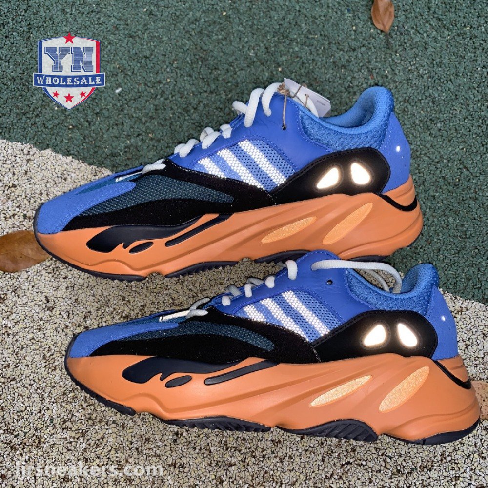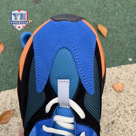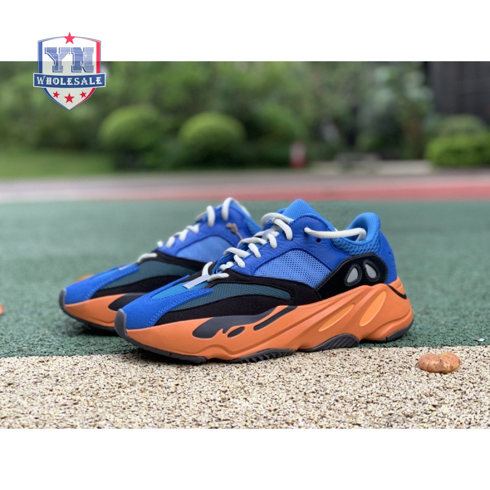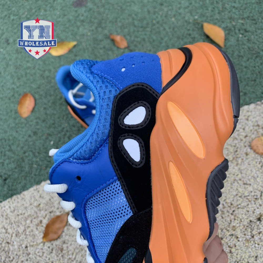 The adidas Yeezy Boost 700 "Bright Blue" uses sharply contrasting finishes to delineate the lifestyle runner"s upper and tooling. The latter pairs sculpted orange sidewalls with a contrasting black rubber outsole, featuring a herringbone traction pattern with cut-out detailing that reveals a drop-in Boost midsole. Up top, royal blue mesh is reinforced with tonal suede overlays at the toe and heel, along with black suede midfoot panels enlivened with reflective detailing.