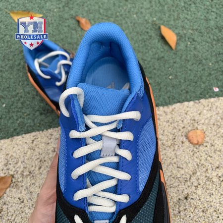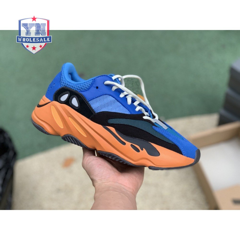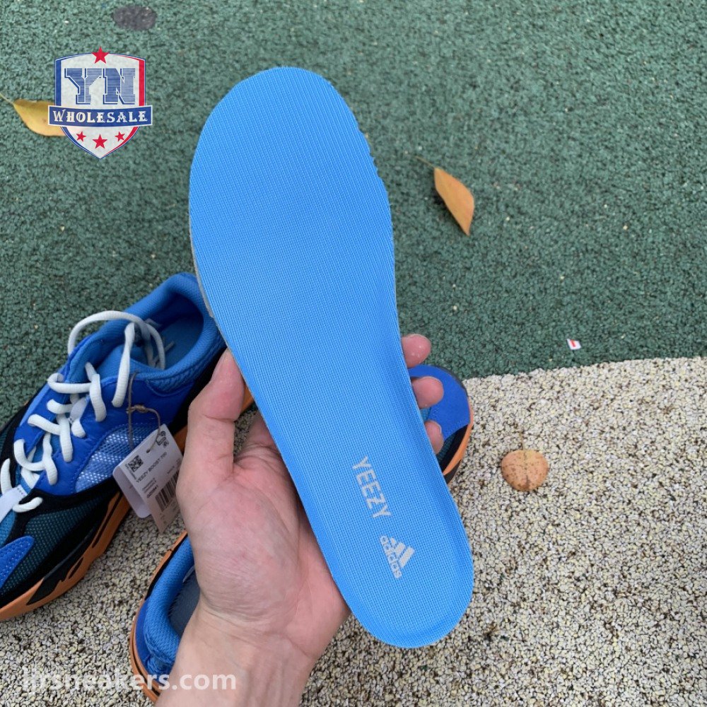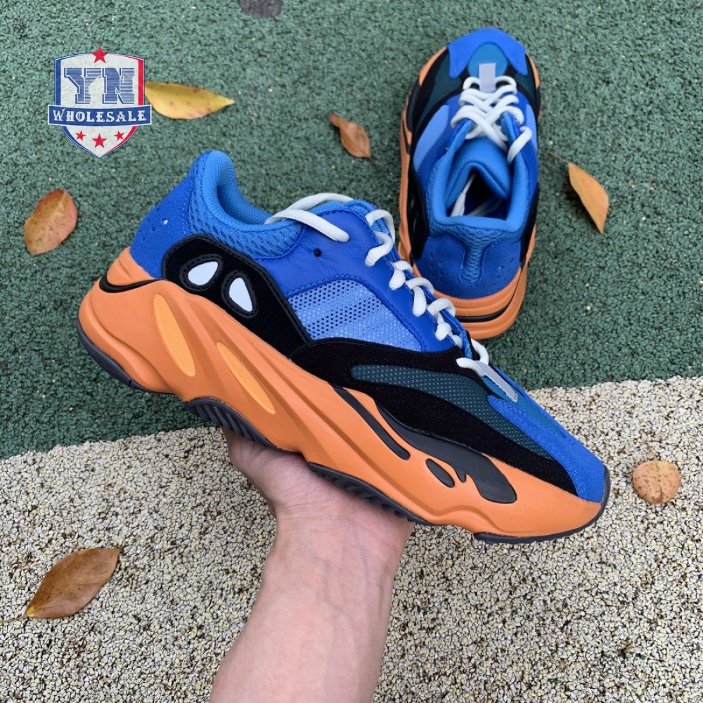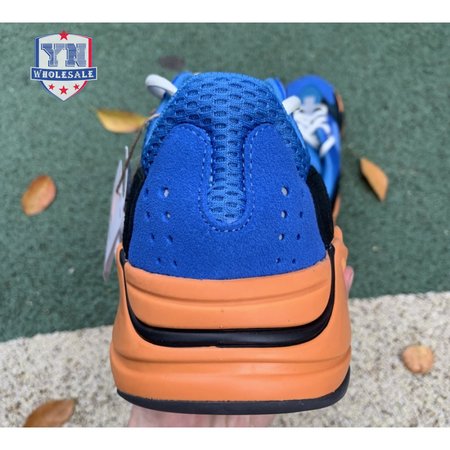 The adidas Yeezy Boost 700 "Bright Blue" uses sharply contrasting finishes to delineate the lifestyle runner"s upper and tooling. The latter pairs sculpted orange sidewalls with a contrasting black rubber outsole, featuring a herringbone traction pattern with cut-out detailing that reveals a drop-in Boost midsole. Up top, royal blue mesh is reinforced with tonal suede overlays at the toe and heel, along with black suede midfoot panels enlivened with reflective detailing.